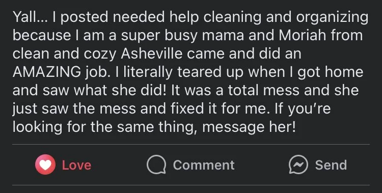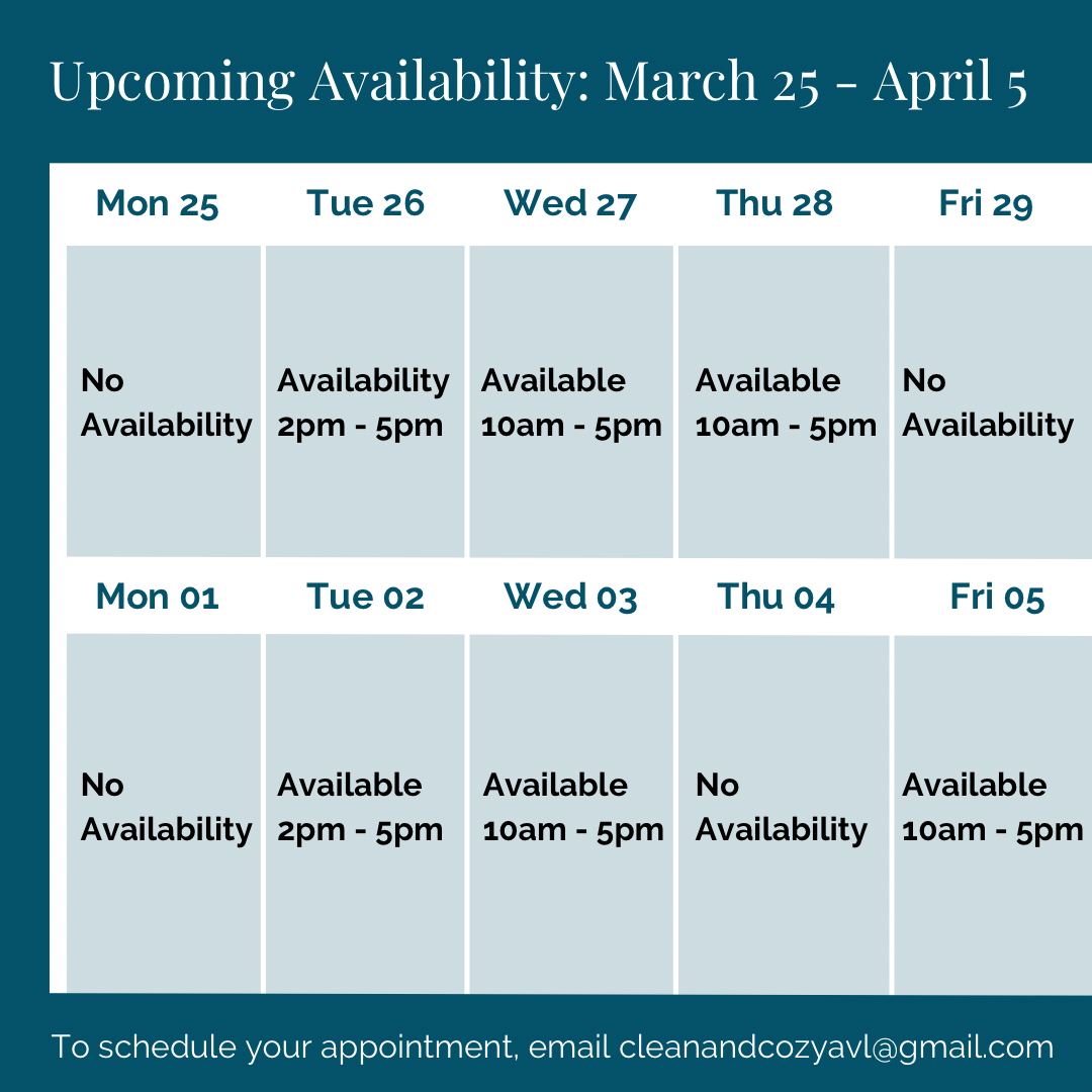 Weekly, every other week, or monthly cleanings to keep your space feeling clean and cozy!